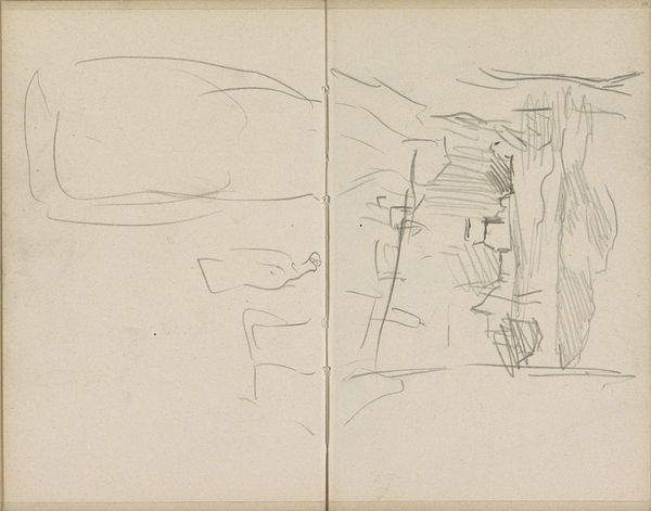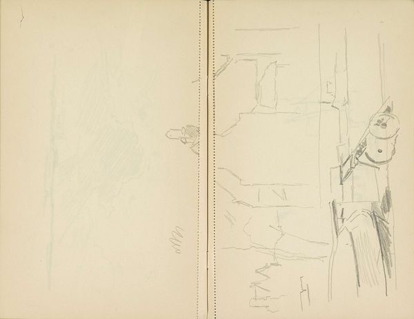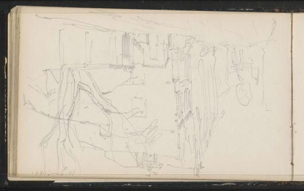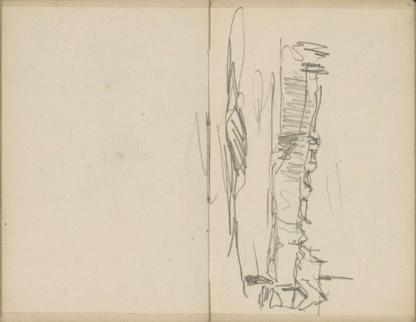 Editor: This is "Man with a Sword in Military Uniform," a graphite drawing on paper by Johannes Bosboom, dating from 1845 to 1891. I’m immediately struck by the looseness of the sketch. It feels unfinished, a mere glimpse into the artist’s process. What do you see in this work? Curator: The incomplete nature is precisely where its interest lies. Notice the composition – the fragmented figures and architectural suggestion juxtaposed. It's a study in form rather than a definitive portrait. Editor: Form? Could you elaborate on what aspects of form you find particularly compelling? Curator: Certainly. Look at how Bosboom uses line. The varying weight and density of the graphite create depth and shadow despite the absence of color or fully rendered forms. The tension lies in what is suggested versus what is explicitly stated. It pushes us, the viewers, to complete the image ourselves. Do you agree? Editor: I see what you mean. It's not about capturing a perfect likeness, but about exploring the possibilities of line and shape to convey a presence. It's almost like the idea of a man, rather than the man himself. Curator: Precisely. The swiftness of the strokes conveys a certain dynamism, even in the stillness of a portrait. It's a raw, unpolished study of visual language. Editor: I didn't initially think of the dynamism. I was focused on the sketchiness. Thank you for that perspective. It highlights the power of suggestion in art, and how the unfinished can be so much more evocative. Curator: Indeed. Art doesn't always need to shout; sometimes, a whisper resonates even more profoundly.