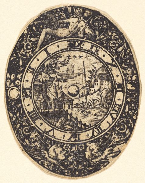 Curator: Here we have an engraving, aptly titled "Landscape," by Antoine Jacquard. I find it fascinating, especially the circular format – almost like peering through a spyglass into another world. Editor: My first thought is how tactile it looks, even in reproduction. The roughness of the print and the pattern around the border give it an almost folk-art feel. Curator: Absolutely. This "folk-art feel," as you call it, reminds me of the way Jacquard often engaged with notions of labor and class. It isn't just a quaint scene; the houses and church are laden with a kind of silent symbolism that invokes power, work, and societal structures. Editor: It certainly deviates from idyllic landscape paintings of the era. Instead, we are given something more humble. Knowing that it is an engraving—a process involving skilled labor— makes me think about how Jacquard's creative process underscores material conditions. Curator: That's precisely where I wanted to go. The act of engraving, the painstaking work—the social environment of its production—these all situate it within wider narratives of inequality and resistance, of the subjugation of labour to artistic pursuit. Where did this piece live? And what hands did it pass through? Editor: Indeed. What narratives were woven around this object? One can envision these kinds of tokens as holding particular value when labour itself, when these objects, circulate within limited contexts. Its production and function blur conventional distinctions between art and craft. Curator: I find myself wanting to dig deeper into what it is saying about place, ownership, the very idea of a 'landscape'. Does it invite you to contemplate a specific geographic or emotional landscape? I wonder, where does Jacquard situate the viewer in relation to these locations? Editor: Ultimately, for me, it provokes thoughts about labour's embodiment of power, the hands, skills, and material process involved to craft this, where the medium, process, and scene become deeply interconnected. Curator: For me, it highlights the inherent tensions and negotiations embedded within every image, demanding we scrutinize our relationship to space, identity, and the forces shaping our perceptions. Editor: It urges a consideration of art as tangible work; that the scene, with all its details, is more than picturesque. It's a reminder of the work and resources embedded in creating an image itself.