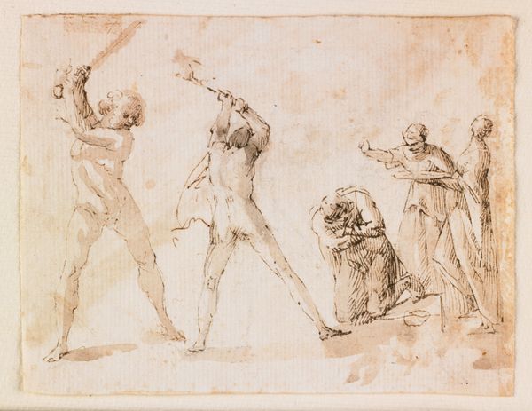 Giovanni Battista Sassi created this drawing of two shepherds and two sheep with pen and brown ink. The figure of the shepherd, a guardian and guide, has deep roots in our collective consciousness. We can see him in ancient Near Eastern art, a symbol of benevolent rule. In Christianity, Christ himself is the Good Shepherd, tending to his flock. Here, the shepherd's gestures evoke protection, yet also suggest a potential threat. This tension between care and control is mirrored in countless images throughout history. Consider the powerful, ambiguous symbolism of animal herding, which can shift from idyllic pastoral scenes to darker portrayals of dominance. The shepherd’s figure taps into primal emotions, embodying both the nurturing and controlling aspects of authority, engaging our subconscious anxieties and desires related to safety, guidance, and autonomy. This archetype resonates through time, transforming but never disappearing.