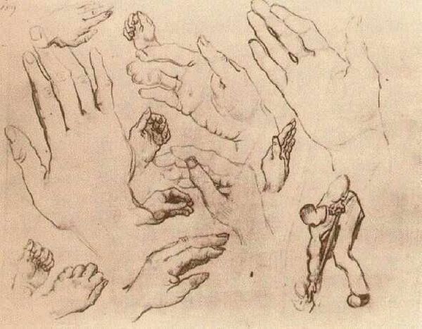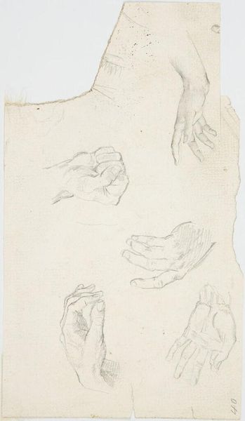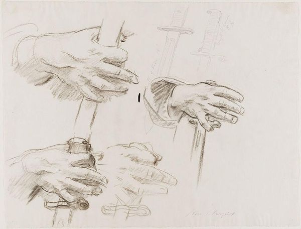 Curator: This is John Singer Sargent's "Studies of Clasped Hands, for 'Apollo and the Muses,' Museum of Fine Arts, Boston," a pencil study residing at the Harvard Art Museums. Editor: It’s striking—the hands seem to convey such a range of emotion, from support to perhaps constraint. Curator: Absolutely. These studies are preparatory drawings. Sargent's murals, particularly in institutions like the Museum of Fine Arts, played a crucial role in shaping public perceptions of art and civic identity. Editor: I see how he’s exploring the power dynamics inherent in touch. Whose hands are these? What are their relationships? Curator: Exactly! Sargent's art often subtly questions the social codes of his time, especially around gender and class. These hands become a site of intersectional narratives. Editor: Looking at the details, I’m struck by how those small gestures speak volumes about human connection and social performance. Curator: Yes, it is a small study with a strong statement, indeed. Editor: It makes you think about the power of touch in a world that’s becoming increasingly disconnected.