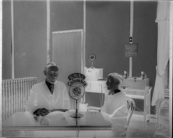 Editor: This photograph by Martin Schweig, simply titled "Untitled (two girls in dresses taking gifts from chair)," presents a curious scene. It strikes me as somewhat haunting, with the inverted tones. What do you see in its composition? Curator: The photograph's strength lies in its stark contrasts and deliberate arrangement. Observe how the strong vertical lines of the blinds and doorframe bookend the scene. Note the interplay of light and shadow, further accentuated by the inverted tones, creating a sense of depth. How does the repetition of rectangular forms—gifts, chair, even the camera itself—impact your reading of the image? Editor: It feels very structured, almost rigid. Is that intentional? Curator: The rigidity could be seen as a commentary on the formal nature of gift-giving, perhaps, or on the constructed artifice of portraiture. The photograph invites us to consider its formal elements and their combined effect. Editor: That's a perspective I hadn't considered. Thank you. Curator: Indeed, a close visual analysis reveals much about the artwork's impact.