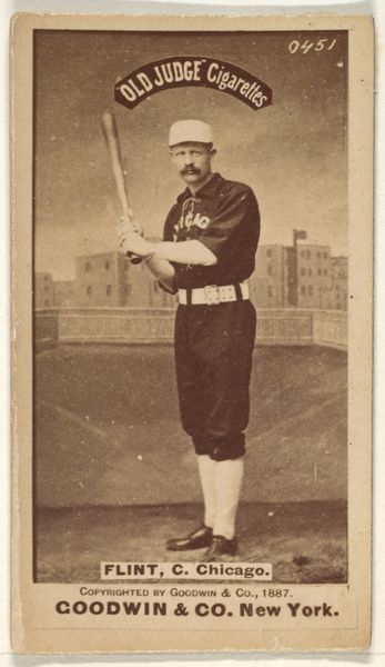 Editor: Here we have "Samuel 'Cliff' Clifford Carroll, Left Field, Washington Nationals," a baseball card made in 1887 by Goodwin & Company. It's a striking gelatin-silver print that gives us such a clear view into the late 19th century! I'm immediately drawn to how this card seems to embody a sense of American masculinity at the time. How do you see it? Curator: That’s a perceptive observation. It's easy to view it solely as a historical artifact. However, consider how it actively participates in constructing and circulating notions of athleticism and national identity. What's implied when we see baseball presented within the same promotional frame as “Old Judge Cigarettes?" Doesn’t this suggest connections between leisure, labor, and perhaps even aspiration? Who was this card marketed to, and what ideas about "the good life" was it selling, beyond baseball and tobacco? Editor: Hmm, interesting. So, beyond simply depicting a baseball player, the image also presents certain cultural values associated with baseball and the ideal American man? The cigarette brand suggests a sort of sophisticated, leisurely lifestyle maybe? Curator: Exactly. This wasn't just about baseball. These cards circulated within a rapidly industrializing nation grappling with shifting gender roles, waves of immigration, and anxieties about leisure and labor. The image attempts to project a sense of stability and idealized masculinity— a white, athletic ideal at a time when definitions of American identity were becoming increasingly contested. Now, how might racial identity factor into who was included—or excluded— from this ideal? Editor: I see your point. Thinking about it through that lens definitely changes my perception of the image. I'm seeing more than just a baseball card; I'm seeing a document that's subtly promoting certain cultural values and reinforcing social hierarchies. Curator: Precisely. Art, even in the form of a baseball card, is never neutral. By analyzing its historical context and its relationship to contemporary social dynamics, we can gain a much deeper understanding of the messages it conveys and the values it promotes, then and now. Editor: That’s fascinating, it is important to unpack these seemingly simple images! Thanks for helping me to see all the underlying stories embedded in this photograph.