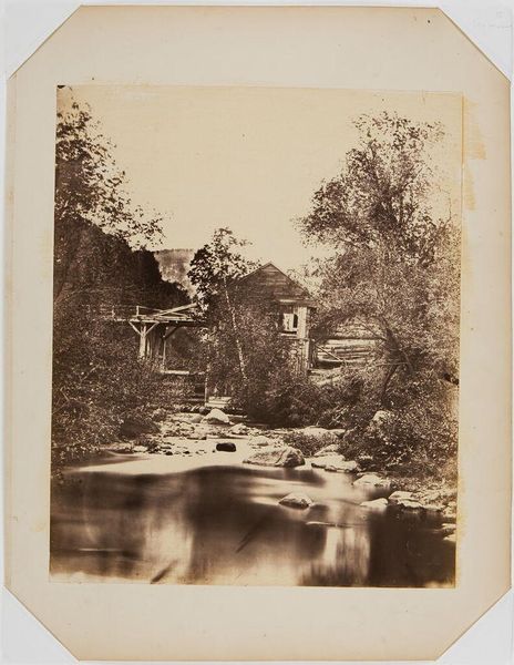 Curator: Welcome. We're looking at Celestino Degoix's "Villa Pallaviani, La Cascata," an albumen print believed to have been made between 1850 and 1870. Editor: Oh, wow, that hits a sweet spot for me. It’s utterly romantic! Sort of brooding and still…it smells of damp earth and old stories, you know? Curator: The photograph utilizes a sophisticated structure, particularly in how Degoix arranges the layers of the landscape. The eye is drawn from the dark pool in the foreground, up through the cascading water, past the bridge, to be ultimately absorbed by the textures within the surrounding vegetation. The tonal gradations are key. Editor: Absolutely. It's a theatrical composition. The little bridge… it’s so inviting, like an entrance into a secret world. And that tiny waterfall, just peeking through! I love the way it frames that smaller cascade in shadow. Curator: Indeed, Degoix employs light and shadow strategically. Note the contrast between the sunlit pavilion on the right and the shadowed depths of the foliage on the left, it adds a dynamic tension and, notably, emphasizes the verticality in what could otherwise be read as a flatter, less compelling composition. Editor: It feels like he is exploring an older, grander narrative. It's less about recording a place than about suggesting… enchantment, longing perhaps. Or at least how small and inconsequential humans appear to the power of raw Nature. Curator: It exemplifies 19th-century landscape photography through its formalism, which served not just to record scenery, but to also establish symbolic or allegorical connections for the viewer. This photograph, rendered meticulously as an albumen print, becomes both document and carefully constructed pictorial space. Editor: For me, that stillness—the frozen moment—intensifies the sense of being somewhere lost in time, perhaps even displaced in memory, a space which remains so private… it hints that any narrative is somehow unfolding only within oneself. Curator: It is tempting to view the natural world as some stage for human emotion, but as an analysis of compositional structures shows, there is so much more than meets the eye at first blush. Editor: Fair point. I might still get lost in there, though.