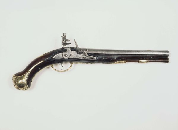 Curator: The object we're looking at is titled "Revolver uit Atjeh," a photograph of a firearm, likely taken between the 1860s and 1870s by Lemat & Girard. Editor: Stark! The composition itself is very direct and rather cold—the metallic greys against that plain backdrop convey an almost clinical precision. It has the austerity of a forensic document, yet there is something undeniably compelling about it. Curator: Indeed. This portrait is rather brutal. Note how the lines of the barrel contrast with the revolver’s ornate handle and trigger. This creates a visual tension. Editor: The “portrait” of a gun—it brings to mind critical questions around the colonial project, especially when we note the reference to Aceh in the title. Who held this weapon, and against whom was it brandished? The implied violence is inescapable, particularly considering Aceh’s resistance against Dutch colonization. The photographic image amplifies it, lending it a sinister veracity. Curator: I see your point about the loaded connotations there. And yet, let’s consider how the texture itself works, and how its form reflects its function; the hard and industrial aesthetic that is, ironically, appealing. I see this and I think of it also as a feat of engineering. Editor: But it is precisely in that engineering that the history becomes unbearable. The sleekness and industrial nature aren't simply about efficient manufacturing, but of efficient violence, systematized oppression of marginalized communities. Curator: I am inclined to agree, up to a certain point. The photograph is not glorifying violence. If anything, this visual examination offers the potential for critical reflection, and even encourages resistance to this weaponizing of power. Editor: Exactly, but recognizing its social impact does not prevent an appreciation of photography. Art's strength resides precisely in provoking complex, sometimes uncomfortable discourse, and not just aesthetic analysis. Curator: A stimulating point. I concede it leaves me pondering the intricate nexus of power, representation, and cultural significance. Editor: Yes, truly considering our history, perhaps we're prompted to challenge established truths, disrupt complacent understandings of progress.