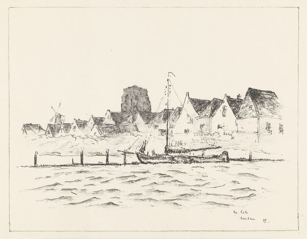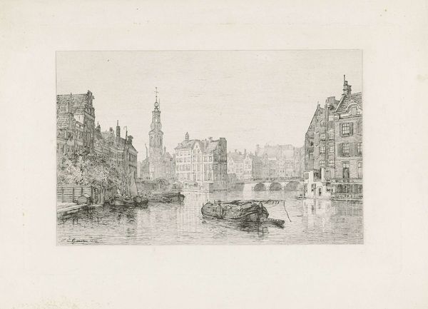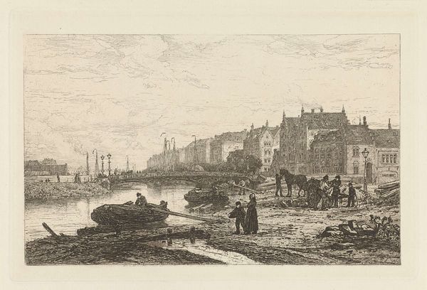 Curator: Ah, yes, “Thames Police” by James Abbott McNeill Whistler, an etching from 1859. What strikes you first about it? Editor: The density, definitely. A claustrophobic feeling despite being a waterside scene. It's incredibly detailed, almost overwhelmingly so. Curator: I see it too. Etchings, especially from this period, are so precise. Whistler’s skill emphasizes a realism—note the architecture, how meticulously rendered each building appears, and then reflect on the time it took to do this! Each mark bears historical witness. Editor: Precisely. The detail gives way to a portrait of industrial labor, of lives intertwined with the Thames. Those aren't pleasure boats, are they? More working vessels, laden with the promise of work, but also the exploitation of labour tied to urban life. It brings up narratives around urbanization and the working class that shaped Victorian England. Curator: The symbolism in maritime art often revolves around journeys, exploration, risk, and reward. Are those visible dynamics that permeate urban life represented within the symbolic structure of London's existence as an active port city? Editor: Indeed. These forms create a historical narrative, showing how the river serves as a backdrop for London's urban development and, indeed, for the development of class structure at large. These details reinforce how economic activity intertwines with identity, class, and social power, even visible at play in maritime traffic. Curator: It is the confluence of the romantic, yes, but here shaped within a gritty industrial reality that serves to tell the more complicated narratives of London itself. And if we reflect on that tower? How Whistler chose that exact framing that placed that architecture at the edge, a type of guardian watching it all play out. Editor: Yes, like the port police, but expanded: the entire infrastructure of the port itself, its relationship to structures of authority in that historical context, its relationship to the entire structure of industrial urbanism on every street. I would agree, a crucial detail with vast meaning to decode. Curator: Exactly, revealing, as always, there's so much more to these glimpses into the past, and they ask us for consideration of how our memories form within the historical, political and personal circumstances of art itself. Editor: Right, even seemingly simple etchings open up entire worlds worth excavating.