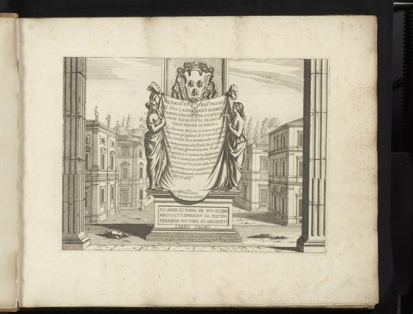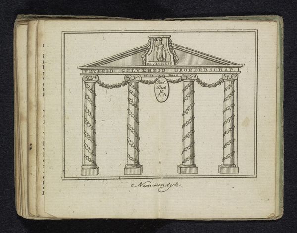 This small print from 1795, whose artist is unknown, depicts decorations at Amsterdam’s Town Hall. It's a study in the power of line and form. Note the sharp, precise lines which define the architectural elements and decorations. The symmetrical composition, with its repetitive columns and arches, gives a sense of order and classical restraint. Above, a series of window frames form a grid, interrupted by oval medallions and festoons. The graphic quality creates a play between depth and flatness, typical of printmaking. The structure here reflects Enlightenment ideals of reason and order. The meticulous detail serves not just as a record, but as a statement of civic pride and the values of Dutch society at the time. The lack of color keeps our focus on the structure of the image itself, emphasizing form as the primary vehicle of meaning. Consider how the lines and shapes work together to create a balanced yet dynamic image. The piece invites us to explore how an arrangement of simple visual elements can convey complex cultural messages.
