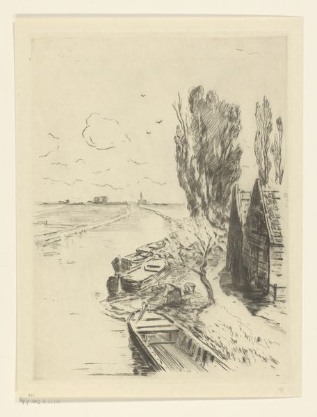 Editor: So, this is Philip Zilcken's "Kaag," an etching from between 1867 and 1890. The impression I get is a sense of quiet, almost stillness. What stands out to you? Curator: That stillness, yes, I think it belies a certain tension, a negotiation between nature and human activity that was very much at the forefront of debates during the late 19th century. We see the windmills in the background and the boat, signs of encroaching industrialization and their effect on the environment. Do you think Zilcken romanticizes or critiques this relationship? Editor: That's a great question! I hadn't really thought about it that way. The detail on the reeds, though, makes it feel like a celebration of the natural landscape. Maybe he's showing both existing in balance? Curator: Perhaps, or maybe hinting at a loss. Think about the Dutch landscape tradition – its deep connection to national identity. This work invites us to consider who has access to that landscape and at what cost? The Kaag region itself was undergoing significant changes, and these shifts deeply affected how people worked, travelled and lived. How do we reconcile progress with the potential displacement of traditional ways of life? Editor: I see what you mean. It's not just a pretty picture; it's raising complex social and economic issues tied to industrialization and national identity. Curator: Exactly. The image quietly speaks volumes. The limited colour palette suggests the constraints being imposed. What can we learn from this landscape when considering present-day debates on environment and society? Editor: This definitely makes me look at the piece in a new light, to see how art is woven into such rich narratives of power and change. Thanks! Curator: It’s crucial to explore these critical intersectional questions so as to create better systems now and in the future!