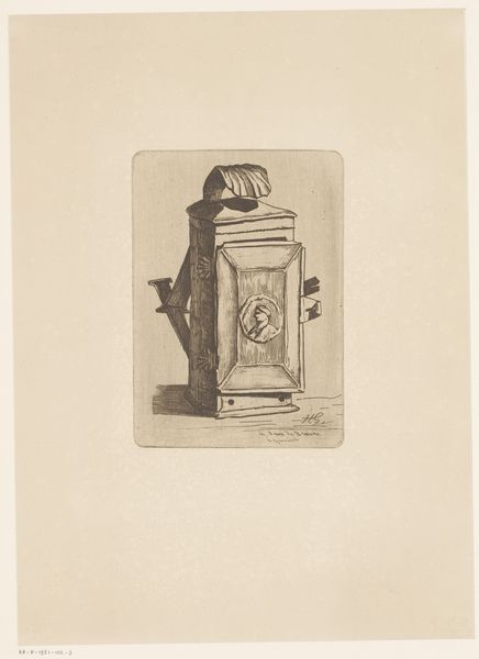 Editor: Here we have Henri-Charles Guérard's "Lantaarn," made sometime between 1856 and 1897. It's an etching, so black ink on paper. There’s an antique lantern rendered in incredibly fine lines... it has a very rough-hewn, functional feel. What jumps out to you when you look at this, from a formalist perspective? Curator: The linework is indeed key. Observe how Guérard uses the etching technique to delineate form through a rigorous application of hatching and cross-hatching. Notice particularly the tonal variations achieved with subtle gradations, a deliberate manipulation that generates volume and surface texture. Do you see how the variations in line thickness impact the perception of depth and light? Editor: I see how he builds up the shading, but it also looks unfinished, like a preliminary sketch. It lacks the precision you often see in etchings. Curator: Precisely. Its unfinished quality contributes to its intrinsic aesthetic. The stark contrast, or lack thereof, between object and background removes all elements beyond form. Is it possible that in prioritizing raw, unfiltered shape we are drawn into contemplating the essential features? Editor: So, it’s the *lack* of polish that makes it interesting? It makes you think about form? Curator: It encourages a consideration of how lines, their density, and their direction combine to communicate both the objectness of the lantern and, dare I say, its aura. Did focusing solely on the technique allow you to understand that in its skeletal form and design the Lantaarn serves less as a source of literal illumination and more as a study of lines and shape. Editor: That makes me appreciate how the sketch-like quality can be a choice. It prompts a focus on structure rather than strict representation. Curator: Exactly!