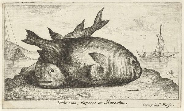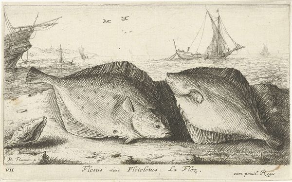 Editor: This engraving, "Twee wijtingen op het strand" or "Two Whitings on the Beach" by Albert Flamen, dates to 1664. It's a pretty straightforward depiction of two fish on the shore, but the level of detail is incredible, especially given the medium. I'm struck by the contrast between the still life in the foreground and the bustling marine scene in the background. What stands out to you about this piece? Curator: Well, looking at it from a historical perspective, it speaks volumes about the culture of the Dutch Golden Age. This wasn't just about accurately depicting fish; it reflected the economic and social importance of the fishing industry. It represents how the burgeoning merchant class defined themselves and projected a national identity rooted in maritime activities. Editor: That makes sense. The ships and figures on the beach give a wider view of maritime activity, but why two dead fish, precisely? Curator: Think about the role of imagery in that period. Scientific illustration was evolving. Note the Latin and French text: it's partly an attempt to document and classify. But it's also about abundance and prosperity—fishing meant wealth. It was powerful messaging during a time when Dutch sea power and commerce were on the rise. Consider also the intended audience - how does access to printed materials influence and create artistic taste and value among this rising middle class? Editor: So, more than just art; it's a statement about the Netherlands' place in the world? And printed images allow it to circulate to that broader audience, promoting that Dutch ideal? Curator: Precisely! What began as, say, documentation, evolved into assertions of national power and collective wealth circulated through newly-accessible printing methods. How different from a royal portrait serving a similar purpose? Editor: I never considered the propaganda aspect. It shows how intertwined art, science, and politics could be. I now appreciate the print on a new level. Curator: Indeed! Art, especially within institutions, often reflects power dynamics. Now you are seeing the piece in relation to its time, the forces, and the people that gave it context.