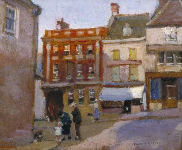 Curator: Quay Street, Ireland, painted by Morland Lewis, presents a muted palette that evokes a somber atmosphere, wouldn't you agree? Editor: Absolutely. The composition, with its dominant verticals, creates a sense of stillness. I wonder what social and political context shaped Lewis's vision of Ireland? Curator: Considering Lewis's life, 1903-1943, one can speculate that the turbulent interwar period, and perhaps even rising anxieties about national identity in Ireland, influenced his artistic perspective. Editor: The stark, almost industrial elements juxtaposed with the domestic architecture hint at a society grappling with modernization and perhaps the loss of traditional ways of life. The painting's materiality—the visible brushstrokes—adds to its raw emotional quality. Curator: Precisely. The greys and browns dominate, creating a visual metaphor for a world in transition. Editor: It's a study in contrasts, compelling and thought-provoking. Curator: Indeed, a potent lens through which to view a specific historical moment.