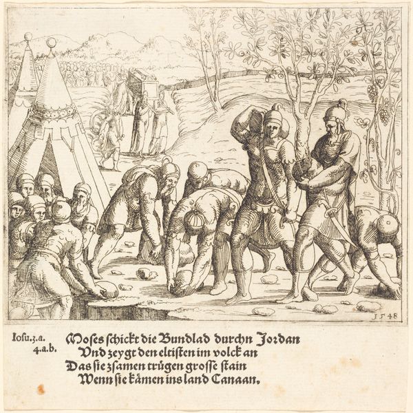 Editor: Here we have "Moses with Outstretched Arms" by Augustin Hirschvogel, created in 1547. It's an engraving, so a print. My first thought is how active and full of conflict the scene feels. So, given this detailed depiction of warfare and religion, what aspects really stand out to you? Curator: What I find striking is the very means of production—an engraving designed for dissemination. Hirschvogel’s choice of printmaking democratizes access to a biblical narrative traditionally confined to wealthier patrons or church settings. Editor: So you’re saying the *how* it’s made changes things? Curator: Precisely! Consider the labor involved: the skilled artisan meticulously carving into a metal plate. That process itself becomes part of the artwork’s meaning. How does the shift to printed images affect our view of the events depicted? Editor: That makes me wonder about the intended audience and how this image was distributed. I imagine it could be shared fairly easily. Curator: Indeed. And with that, new interpretations, no longer beholden only to powerful authorities, begin to appear in society through more easily accessed images. Did that have a ripple effect? Absolutely. Editor: This perspective really shifted how I'm thinking about it; seeing it less as an illustration of a story, and more as an act of production meant for widespread dissemination, which transforms it entirely. Curator: And hopefully emphasizes art’s dynamic relationship to the society from which it emerges, an economic force changing how society perceives its very stories.