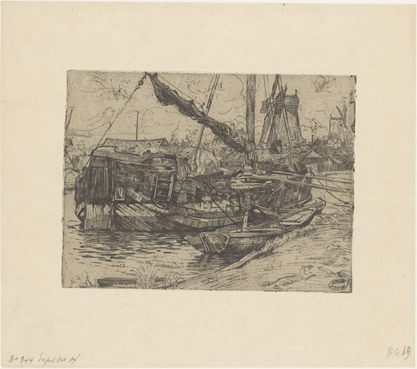 Curator: This is "Afgemeerde vissersschepen in een haven," or "Moored Fishing Boats in a Harbor," created by Otto Hanrath in 1923. It's a compelling image rendered using print, pencil, and woodcut techniques. Editor: My first thought? Somber beauty. There's a certain quiet melancholy radiating from those docked boats, like they're holding their breath before the next big adventure, or perhaps exhausted from one that has ended. Curator: That sense of quietude certainly permeates the work. It reflects a broader trend in early 20th-century art, where scenes of working life were often imbued with a sense of dignity and respect, even when depicting hardship. Hanrath positions these vessels as essential to community identity and labor history. Editor: True. And the muted tones contribute to that feeling. It looks like it's from a personal sketchbook, a fleeting moment observed and captured with delicate strokes, light pencil work that provides contrast against some detailed sketching in darker media. It's raw and vulnerable. I think you see those delicate spars standing erect and appreciate that those masts go so very high while the boats sit still here now in these shallows, at rest but ever-reaching! Curator: Precisely! The interplay between the grounded boats and the reaching masts provides visual interest. Considering it as a print—perhaps even a woodcut—invites us to think about how the image might have been disseminated, reproduced, and seen by a wider audience, impacting public perceptions. Editor: Makes me wonder about the fishermen themselves. Are they home, asleep? Or still out on the water? Are these just the tools of labour? The pencil sketch is suggestive and allows room for a lot of questions. But it's all those pen marks massing into the sky in the distance—did they bring good weather? Bad weather? A sense of both. That’s realism. Curator: The setting would likely resonate with the contemporary audience of the time, perhaps more familiar with such everyday harbor scenes. But also, its style may evoke themes around industrial change affecting harbor communities at the time, as realism started incorporating a lot of social issues into the discussion. Editor: Agreed! In this stillness, that boat points upwards, almost urging me towards the sky. These boats can and will move again. I think I could spend hours with it, and still find something new. Curator: Indeed. A simple image, with a complex social history under its belt.