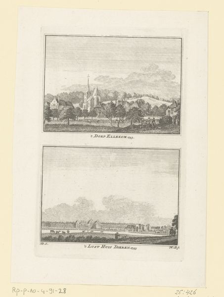 Curator: This print presents “Twee gezichten op Willemstad (Noord-Brabant),” created by Carel Frederik (I) Bendorp between 1786 and 1792. It currently resides in the Rijksmuseum collection. Editor: It's quite calming, actually. The pale, almost ghostly palette creates a serene atmosphere. The detailed linework, despite its small scale, gives a clear picture of this Dutch cityscape. Curator: Indeed. Considering its period, it exemplifies the rise of Neoclassicism within Dutch printmaking. These types of prints circulated widely, influencing how people viewed their surroundings and fostered a sense of local identity. The muted tones reflect the constraints and aesthetics of the engraving technique but also the socio-political climate that valued order and clarity. Editor: I notice there are two distinct images. The top focuses on the town itself, with a windmill prominently displayed, almost as if guarding it. While the lower view highlights the city from across the water, emphasizing the importance of trade and connection. Curator: Precisely! These dual perspectives were not uncommon, reflecting the dual role of cities at the time—both enclosed, self-governing entities and outward-facing hubs of commerce. The work gives insight into 18th-century perspectives of spatial relationships and civic identity. The visual choices certainly echo burgeoning class structures and shifting social stratifications too, suggesting how the population interacted. Editor: The fact that this artwork exists as a print also tells us something. It speaks to broader accessibility and a rising literate populace. These images were intended to be distributed, consumed, and discussed. Curator: Exactly! And we must remember the socio-economic implications of printing in those days. Who owned the printing presses? Who had access to the images produced? All part of understanding its role in the era. Editor: This careful engraving offers a tranquil glimpse into the past. Thank you for guiding me into some context around it! Curator: My pleasure. Understanding the intricate relationships among art, history, and societal evolution provides critical insight for our times.