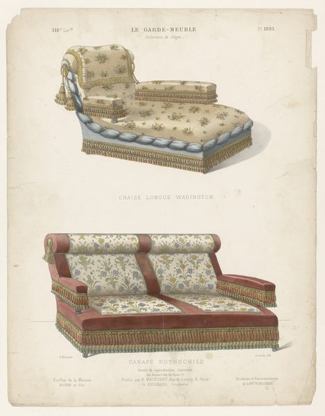 Curator: What a striking page of furniture studies! This drawing, titled "Canapé, fauteuil en stoel," was created between 1885 and 1895 by Léon Laroche. The medium is ink on paper, showcasing Art Nouveau and decorative art elements. Editor: I’m immediately struck by the sense of idealized domesticity here. The restrained palette, those dainty tassels... it feels almost suffocatingly proper. Curator: Interesting you say that. Let's delve a bit deeper. Given the late 19th-century context, particularly during the height of the Belle Époque, these furnishings speak to a rising bourgeois class consolidating wealth and attempting to perform status. The "petit russien" style advertised here is not simply about aesthetics; it's about aspirational identity and geopolitical posturing, where appropriating exotic or "foreign" design elements becomes a signifier of cultural capital. Editor: Yes, and notice the specific repetition of motifs: a singular flower shape appears both in the seat-back tapestry and, reduced and simplified, within the border design. The flower, of course, historically laden with connotations of femininity and luxury, serves to further underscore ideals about feminine containment in the domestic sphere. Curator: Precisely. Moreover, this imagery serves as a cultural marker of power dynamics at play, especially relating to gender roles within emerging capitalist structures during this period. Laroche is not simply rendering furniture. He's tacitly reflecting, and potentially reinforcing, systems of hierarchy operating in French society through domestic accoutrements. Editor: Indeed. We also can consider the effect of such mass-produced drawings intended for prospective customers. To select particular symbolic features—here the green velvet, the repeated blossom shape, the gentle gold of the tassel edging—is not a random action but a declaration of alignment to cultural narratives. To display or inhabit these carefully crafted arrangements performs identity and social position for its inhabitants. Curator: What's compelling is observing the through line linking aesthetics, symbolism, social power, and marketing. We can start understanding furniture's roles within identity-making practices of the 19th century onward, allowing people to create identity using objects that embody status and aspiration. Editor: These drawings remind me to be aware that the apparently "simple" task of choosing a seat in one's own home in fact bears complex connections with a host of political and personal reverberations that continue today.
