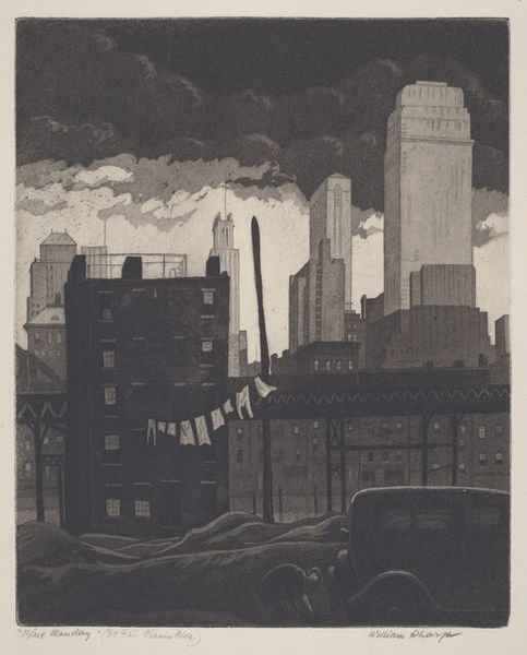 Editor: So this is Martin Lewis’ print, "Building a Babylon, Tudor City, N.Y.C." The stark contrast and the looming buildings give it such a dramatic feel. What strikes you about this piece? Curator: It’s the stark depiction of urban construction that grabs me. Consider the labor involved: the digging, the lifting, the sheer physicality of building this 'Babylon.' Lewis isn’t just showing us the architecture, but the process – the making and the human effort of it all. Editor: That’s a really interesting point. It's easy to overlook the labor when you see only the finished product. Curator: Exactly. And look at the materials – the rough-hewn timbers, the raw earth. How do they contrast with the promise of the sleek, modern towers? Is it a critique of progress, or a celebration of human ingenuity? Editor: I hadn't thought about it that way. It gives me a lot to consider.