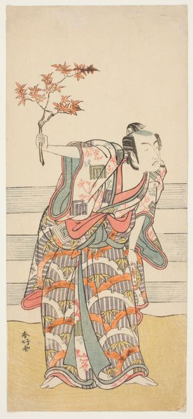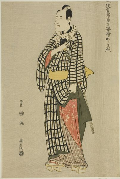 This woodblock print by Utagawa Toyokuni I presents the actor Ichikawa Yaozo III in character; a study in line, color, and form that speaks volumes about Edo-period aesthetics. The actor is captured in a dynamic pose, his body slightly angled, which creates an interesting interplay with the flat picture plane. Toyokuni masterfully uses line to define the figure, from the sharp contours of the actor's face to the intricate patterns of his robe. The composition is carefully balanced, with the figure offset to the right, counterweighted by the inscription to the left. Note how the swirling cloud patterns on the kimono disrupt any sense of a stable, unified identity. This challenges fixed meanings and instead suggests a fluidity and multiplicity of self. Ultimately, this print is more than just a portrait of an actor; it is an exploration of representation, identity, and the very nature of performance.