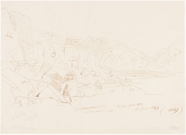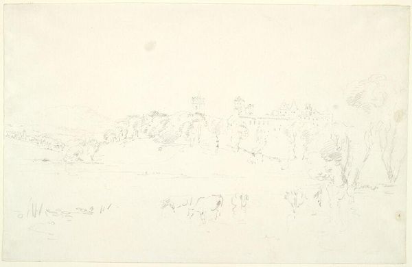 Editor: This is Joshua Cristall’s "Scottish Landscape with Figures," a pencil drawing. It feels like a fleeting glimpse into a rural scene. What do you see in this piece, beyond the surface? Curator: I see a romanticized vision of the Scottish Highlands, but one that likely obscures the realities of life for those living there. Cristall, as an outsider, perhaps didn’t fully grasp the socio-economic struggles within that landscape. What kind of narrative do you think the inclusion of figures adds? Editor: It makes me wonder who these people are, how they relate to the land. Are they landowners or laborers? Does the artist give them agency or reduce them to elements of the scenery? Curator: Exactly. We must consider how landscape art can both celebrate and exploit a place, influencing how we perceive identity and belonging within it. Editor: I never thought of landscapes as having that sort of power dynamic embedded in them. Thank you! Curator: It's a lens we must always apply: who is telling the story, and whose voices are missing?