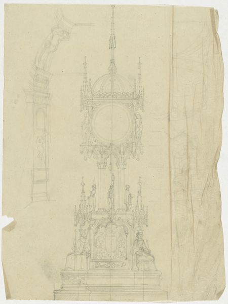 Editor: Here we have "Reliekhouder," or "Relic Holder," a pencil, etching, and drawing on paper, created around 1830-1850 by Firma Feuchère. The wispy lines give it an ephemeral quality, like a memory. It’s hard to tell what it looked like. What stands out to you when you see it? Curator: This skeletal structure is interesting precisely because of its incompleteness. What relics were meant to be housed here? It seems to draw on a deep cultural well, mixing Christian reliquaries with perhaps something more secular, a celebration of lineage or national heroes. The symbolic language, though faded, feels intentional. Do you get a sense of what this could signify? Editor: It looks like a medieval cathedral, maybe something that would hold a saint's bones? There’s something imposing, but also delicate about it. Like a dream about power and religion. Curator: Exactly! It's reaching for something grand and perhaps unattainable. Think of the relic as a fragment, a tangible connection to a powerful idea. This "Reliekhouder" becomes more than just architecture; it's an attempt to hold onto memory, faith, or historical narrative, perhaps even invent one. The hazy nature reflects its intended purpose: not exact duplication but evocative sentimentality. Editor: That’s so fascinating. I initially saw it as incomplete, but it's holding so many potential meanings! Curator: It asks us to participate in its completion, doesn't it? What feelings did relics in churches arouse? Does this relate to feelings connected with keepsakes in your home? How might architectural designs inspire strong emotional, even spiritual feeling? Editor: It gives you the emotional feeling without telling you exactly what it should be. Thanks for that! It changes how I look at not only this sketch but anything religious now. Curator: Absolutely! Every line, even those lightly sketched, carries the weight of cultural memory, waiting to be decoded.