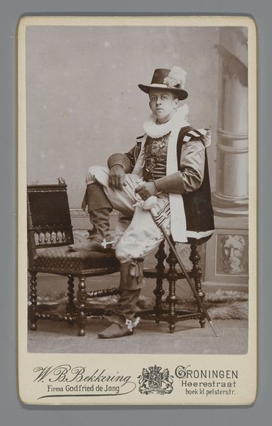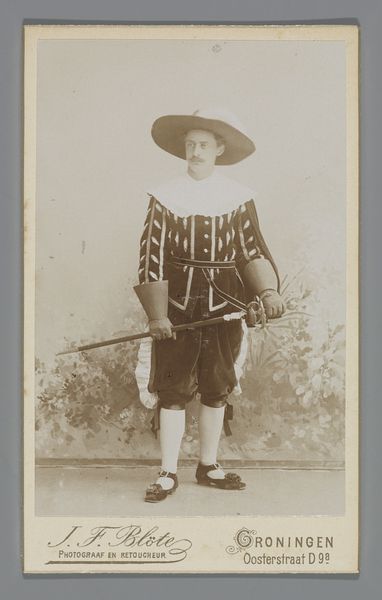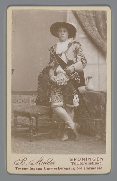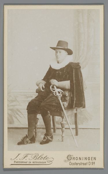 Curator: This striking photograph is titled "Portret van een onbekende Groningse student in maskeradekostuum," dating from somewhere between 1896 and 1900. It’s attributed to Jan Frederik Blöte. Editor: What a dandy! The pose is so deliberate, so staged. It feels a bit... I don’t know, almost sweetly absurd? Like a teenager raiding their parents' attic and putting on a show. Curator: Indeed! These were popular images at the time. Studio photography offered a certain amount of performativity; it provided a space for individuals to present an idealized or theatrical version of themselves. And historical fancy dress was very fashionable. Editor: There’s something charming about the fact that it's sepia-toned, making this masquerade seem like an echo from a truly distant past, not just a century or so. Also the almost theatrical nature of portraiture— I mean, the backdrop with what seems to be a stage curtain behind him, and his confident sword-and-everything posture...It's great! I can picture him hamming it up. Curator: Note also the deliberate use of props like the antique chair and table. These were likely part of the photographer’s studio setup, lending a sense of historical gravitas, however artificial. This particular style of costume—ruffed collar, wide-brimmed hat, bloused sleeves, and high riding boots—is emulating the fashions popular in the Dutch Golden Age. Editor: He almost seems like he’s channeling Rembrandt or some other golden-age artist that lived during that period. It's this funny little dance between eras that is quite strange when you give it a second thought.. It does have this timelessness. I imagine that if that was taken a hundred years prior, we'd still find this equally strange. Curator: And it points to how historical images, and even our present-day images, participate in shaping our sense of historical style and social identity. Editor: I love it! It's a window into the human impulse to dress up, perform, and maybe, just maybe, believe for a moment that you are the swashbuckling hero in your own story.
