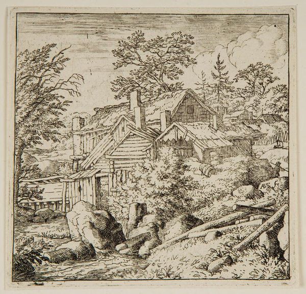Curator: This is Francesco Valesio's "Apelles the Hermit," a print depicting, well, just that! What a cozy, contemplative scene! What strikes you? Editor: It feels so detailed for a print, almost like a drawing, and evokes this sense of quiet solitude. What do you see in this piece, beyond the obvious? Curator: It's the tension, isn't it? Apelles, diligently studying, juxtaposed against this wild, overgrown landscape. Makes you wonder what he's searching for, doesn't it? Perhaps wisdom in nature, or escape from the world. Editor: That makes a lot of sense. I didn’t think about the tension between the man and the landscape. Curator: It's a journey of the soul, etched in ink. Hopefully, we all can discover something new looking at it. Editor: Definitely, I think that I get the tension now. Thanks!