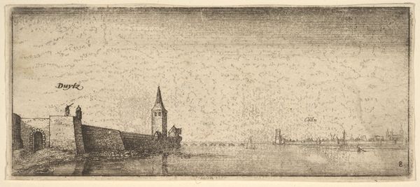 Curator: This is Wenceslaus Hollar's "Bonn," an etching created between 1642 and 1644. Editor: There's a wonderful tranquility to it, a serene composition using almost minimalist lines. The horizontal emphasis, broken only by the buildings, gives a real sense of peace. Curator: Absolutely. Hollar was a master printmaker, and this work really showcases his technique. Consider the process—the labor-intensive etching of the plate, the inking, the pressing. He was capturing Bonn at a pivotal historical moment during the Thirty Years’ War. Editor: Indeed, but within that historical context, the buildings themselves are carefully delineated, creating a hierarchy. Note the size and detail given to the most important buildings; then consider the strategic positioning of the windmill. It creates such a compelling composition of shapes and shades, it’s like a visual score. Curator: It speaks volumes about urban life, the role of trade, of agriculture, and the societal structures that were prevalent then. The work's scale also suggests something about trade; how might they see themselves represented within their landscape. Editor: Scale is crucial. Even with its relatively small size, it still captures the essence of the city reflecting its identity. There's almost a photographic realism but stylized by the etched medium and artistic conventions of the time. I want to analyze the symbolism here, and what it offers in relation to history of conflict! Curator: These images functioned as records, yes, but also as propaganda tools during periods of conflict to cement the urban area from a position of the war to manufacture power through art production. And beyond just the image, consider how these prints were disseminated, influencing perception and understanding of distant lands for diverse groups across Europe. Editor: I agree. Studying "Bonn," however, you notice the interplay of horizontal lines with vertical architectural features; together these features create a subtle rhythm. The work reveals Hollar's mastery not only in representing the city's architecture but also in creating an emotive and aesthetically striking picture. Curator: Precisely! So, through a social and material understanding of etching, we gained a greater appreciation. Editor: Indeed. Analyzing through a composition and artistic perspective leads to understanding more.