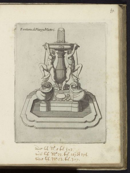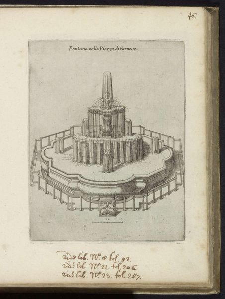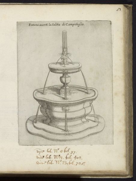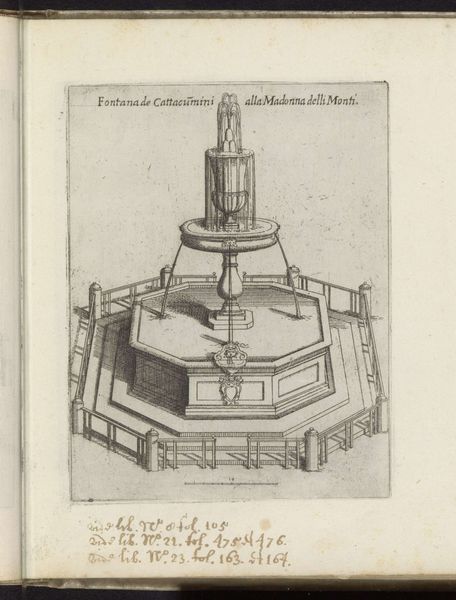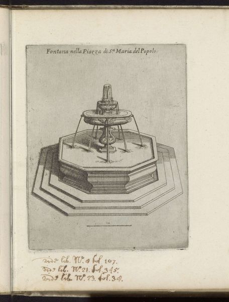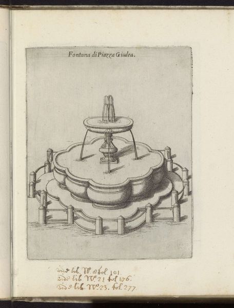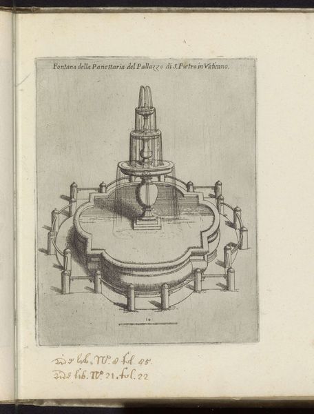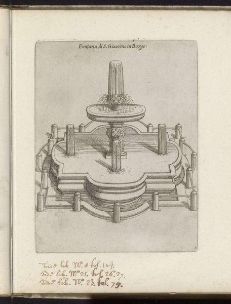 Editor: This is "Fontein in de Cortile del Belvedere te Vaticaanstad," a pen and ink drawing from 1637 by Domenico Parasacchi. It looks like a carefully rendered architectural study. The use of perspective is interesting... almost feels like a stage set. What strikes you about this drawing? Curator: I see a potent symbol of renewal and continuity. Fountains, particularly in such a prominent location as the Vatican, have long served as a testament to power, both spiritual and temporal. Water, of course, represents cleansing, life, and the source of all things. Notice the geometric precision—the artist meticulously renders the fountain’s form. What does that level of detail suggest to you? Editor: Maybe a desire for control or order? I mean, it's a pretty structured fountain. Curator: Precisely! And control and order are key themes here. The Baroque period, though exuberant, often grappled with themes of power, faith, and human destiny. This fountain, depicted with such precision, can be seen as an attempt to harness the chaotic force of nature, to bring it into a man-made structure reflecting divine order. Does the sketch-like quality alter that reading for you? Editor: Well, it does make it feel more like a personal reflection, a moment captured in time rather than a grand statement. Curator: Exactly. Even a sketch, like a carefully chosen icon, speaks volumes about the cultural memory embedded within seemingly simple forms. I find that the interplay between spontaneity and rigorous structure enhances the narrative power. Editor: I see that now. The sketch makes it less about grand authority and more about the individual engaging with these symbols. It's really changed how I see it. Thanks! Curator: A dialogue with an image, much like water itself, refreshes and expands our understanding.