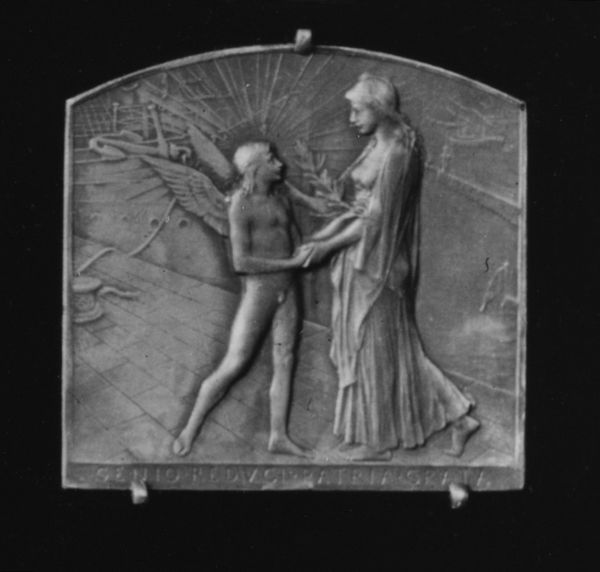 Curator: This relief sculpture, titled "To Commemorate the Jubilee of the Maison Christofle, 1842–92," by Louis-Oscar Roty, dates back to 1893. It’s made of metal, and I think it's meant to celebrate industry. I'm curious, what aspects of its cultural or production context particularly stand out to you? Editor: The way it's divided into three distinct scenes strikes me first. On the left, we see someone working, with industrial buildings in the background. The center has a seated figure, seemingly receiving something from another. And on the right, we have a person relaxing, with trees and foliage behind. How does this breakdown fit within a late 19th-century social narrative? Curator: Absolutely. I’d encourage you to think about what this division signifies. What do you observe in the labor, or process, displayed in the leftmost scene, set against an industrial background? It calls to mind an emphasis on artisanal beginnings transformed by mass production of metal works—hallmarks of the Christofle firm. Does the act of producing a medal inherently link its subject matter with high value? Editor: So the metal itself emphasizes the Maison Christofle's value, and links the process of making with the image? I also notice the figure of "science", who is perhaps offering expertise... but the relationship between those offering expertise, those undertaking manufacture, and those experiencing leisure is left unexplained. Is Roty trying to naturalize those industrial hierarchies? Curator: Precisely. Note also the sharp distinction in environments, the stark contrast in backgrounds, and the almost allegorical roles assigned to figures to tell a historical narrative. What this medal perhaps misses, or maybe intentionally excludes, are the people that are consuming this labour. Why do you think Roty omitted their point of view? Editor: That makes a lot of sense now, considering the material used and how it connects back to the commemorative purpose. Thinking about the absence of those consumers does highlight the intended audience of the medal as being those in that same production cycle. Curator: Precisely, reflecting upon those cycles and the relationship between industry and art gives us insight into not only this commemorative medal but its place as material culture, too. It challenges conventional notions of beauty and reminds us that meaning is constructed through the tangible realities of creation and the world that consumes these goods. Editor: Definitely gives me a different appreciation for medals and other commemorative works that seem ubiquitous today. Thank you!