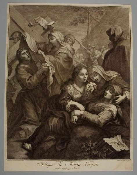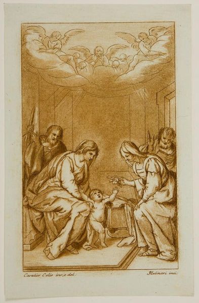 Curator: This print, "Adoration of the Shepherds," was created by Jean Daullé, an artist who lived from 1703 to 1763. It’s currently held in the Harvard Art Museums collection. Editor: The engraving has a very striking, ethereal quality. The stark contrasts really highlight the drama of the scene. Curator: Daullé’s work invites us to consider the intersection of religious narratives and social realities. How might this image have shaped the viewer's understanding of power dynamics and spiritual devotion? Editor: What strikes me is the incredible skill required to produce this image. Consider the physical labor involved in creating such intricate details through engraving – the process itself speaks to a deep devotion. Curator: Absolutely. We can also read into the positioning of the figures—Mary kneeling, Joseph standing off to the side—to explore gender roles and societal expectations. Editor: And the materiality of the print itself— the paper, the ink, the tools— all connect to the economics of art production during Daullé’s time. Curator: Thinking about the image and its potential influence on political and religious ideologies opens up a complex discussion. Editor: Indeed, considering the craftsmanship alongside its historical context reveals a rich tapestry of social and material conditions.
