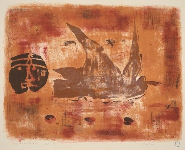 Curator: Looking at "Figura Es Hold" by Vajda Lajos, its scale is almost human size at 92 by 62cm. This piece presents such a stark contrast between geometric and organic shapes. Editor: Yeah, there's a fragility to the drawing; almost like you are peering at faded memory, one barely holding to the page. The lines look uncertain but considered. Curator: This piece seems simple, but reflects on themes like abstraction and form. Lajos had roots in constructivism and surrealism—the techniques visible are pencils, colored pencils, drawing materials, the very instruments of design. How do you think Lajos's social circumstances may be reflecting within this work? Editor: This resonates as something unearthed. The lines create an anatomy—fragmentary and uncertain. Given its materiality, one may see something inherently unsettling from found sketches, or palimpsests, but this does carry this through the drawing’s own form too. This makes the moon a simple inclusion and almost poignant as a symbol of melancholic presence. Curator: Well put, that emotional undercurrent is crucial. His exploration of material, particularly within those stark pencil strokes, speaks to a raw, perhaps vulnerable approach in artmaking. Editor: Ultimately, there's beauty to the unrefined process. Vajda's piece whispers about transformation and time, leaving behind fragmented imprints on how art can carry life and perception within it. Curator: Yes, exactly! Lajos, I imagine, hoped to touch on that ephemeral yet foundational aspect of perception, reminding us of the value found even within fragility.
