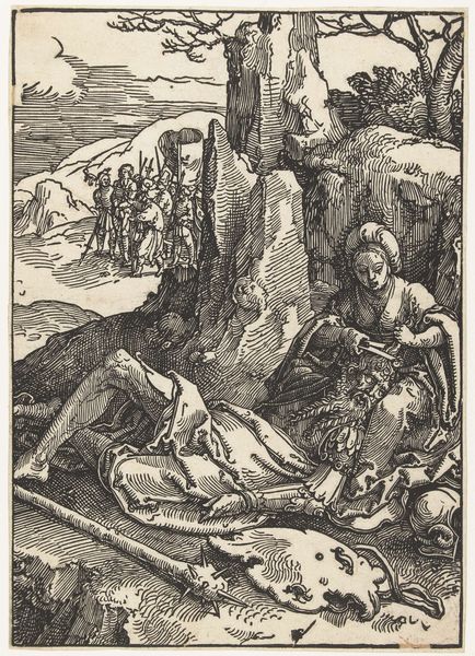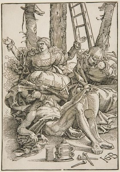 Curator: Look at this haunting woodcut, "Lamentation," created around 1515 by Hans Baldung. Editor: My first impression is how intensely wrought with emotion this is. The heavy lines, the figures almost piled atop each other... it's overwhelmingly grief-stricken. Curator: It’s powerful, isn't it? Baldung, a prominent figure in the Northern Renaissance, really utilizes the woodcut medium to its full potential here. The stark contrast between light and shadow contributes to the overall dramatic effect, a characteristic hallmark of that period. The lines, deeply etched, emphasize not just form but also emotional tension. Editor: Thinking about the production of this image, imagine the labor involved in carving those incredibly detailed lines into the woodblock! The fact that this image would then have been widely reproduced means that Baldung's depiction of grief became a shared experience across the communities that viewed it. It takes a well known moment in Christian lore and makes it accessible and tangible for mass consumption. Curator: Precisely. The choice of a print, rather than a unique painting, speaks volumes about the intended audience and the socio-political function of the image. Prints were, of course, far more accessible and allowed for the dissemination of ideas. In the context of the Reformation brewing at the time, the lamentation of Christ, imbued with this much suffering, would surely elicit strong emotional responses. It was also made for ordinary folks in the North to consider the role of grief in the most important story of Christianity. Editor: Consider also how the figures are clothed. The elaborate attire of the mourning women – those ruffled collars, for instance – highlights not only their status, but also the society to which this image circulated. By so clearly reflecting material culture, the artwork integrates sacred narrative into the everyday. The inclusion of items such as ointment jars and nails is also indicative of their world. Curator: That’s insightful, highlighting that intersection of the divine and the material. For me, what’s particularly striking is how Baldung used the print medium to create a powerful public expression of faith and suffering in a time of great social and religious upheaval. It encouraged empathy, perhaps even action. Editor: Yes, the art makes us appreciate the intersection of devotion, craft, and cultural dialogue happening around the print and images in the everyday lives of those in Baldung's society.