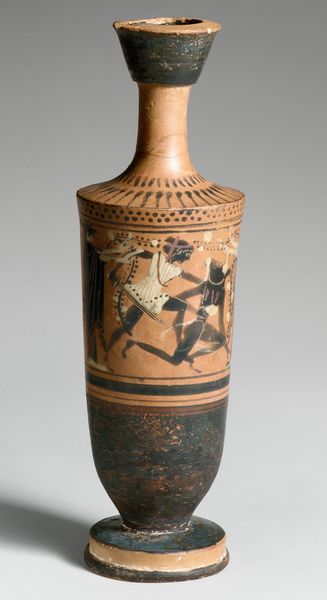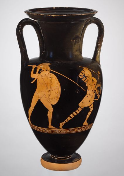 Editor: This is a fragment of a terracotta loutrophoros, a ceremonial vase, dating back to 440 BC and attributed to the Group of Polygnotos. Looking at this vase, what immediately strikes me is the dynamic depiction of the figures despite its fragmented state. What can you tell me about the context this object was created within? Curator: This loutrophoros, used to carry water for wedding rituals or funerary rites for the unmarried, provides fascinating insight into Athenian social customs and the politicization of imagery. The depiction of figures, possibly a wedding procession, isn't merely decorative; it reinforces societal expectations. Think about the vase's public role in reinforcing traditions surrounding marriage and death – ceremonies highly significant for the polis' social cohesion. Does seeing the function and the imagery together give you other ideas about it? Editor: Yes, it does. Considering its purpose in ritualistic events, the imagery does seem intended to communicate ideals and solidify societal norms, maybe even propagandize them a bit. Curator: Precisely. And notice how even in this fragment, the style and the medium speak to the advanced ceramic traditions of Athens. How would displaying vases like these publicly influence community values, you think? Editor: Well, because everyone could view the image and connect its symbols to the broader function, this type of vase naturalized the cultural practices and the implied beliefs surrounding the ceremonies it took part in. So I wonder who had the most access to viewing it. Curator: It’s likely this piece resided in elite homes and burial grounds, but it reveals how integral public rituals and their associated material culture were in shaping the Athenian worldview. Editor: That's amazing to consider; seeing the political role of such intimate, ceremonial objects. It makes the object much richer. Curator: Absolutely. And it highlights the lasting influence of Greek artistic conventions on social behavior through ritual.