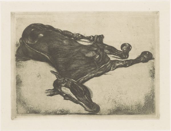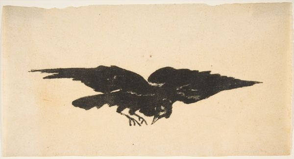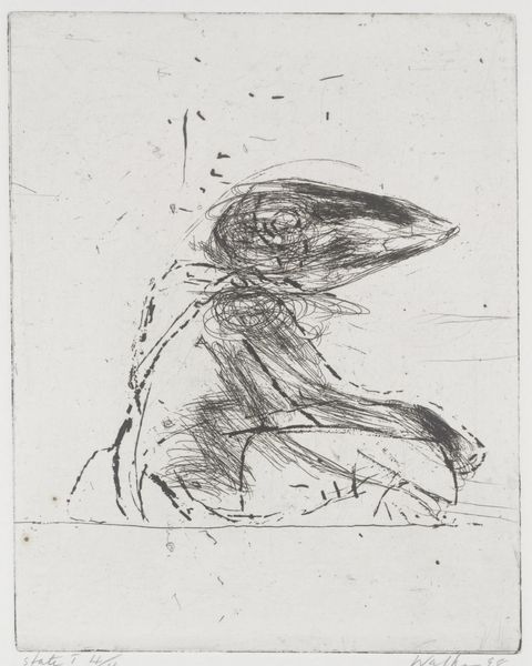 Editor: So, this is Chagall’s etching, "The Eagle and the Beetle," from somewhere around 1927-1930. It's… strange, a bit haunting even. I can't help but focus on this creature in the sky. Is it menacing, or is it protecting those tiny figures beneath? What do you see in this piece? Curator: Haunting is a good word! I think it is one of a series illustrating fables by Jean de La Fontaine, so what we are seeing could be an illustration of the fable where the eagle drops the beetle. But let's consider the personal symbolism at play here. This bird – a grotesque amalgam of creatures – might reflect Chagall’s anxieties. Is it a self-portrait, maybe? Look how vulnerable the little beetle is. Perhaps Chagall saw himself as that beetle, fragile amidst a chaotic world. Does that idea resonate with you at all? Editor: I see what you mean! Thinking about Chagall’s life, the upheaval and displacement he experienced, it makes sense that this bird carries that… unease. But then, is there also a sense of protection? Like the bird is guarding something precious even with all its strangeness? Curator: Exactly! Art, especially surrealism, isn't always about clear answers. It's about holding those contrasting feelings in suspension. It's about wrestling with the tensions that make us human. What do you think he hoped to achieve in the etching process versus with paint? Editor: Hmmm... Maybe etching helped him achieve this delicate balance, this fragility? Paint seems a bit… too solid for such a dreamlike image. This conversation has certainly given me new perspectives. I saw menace, but now I also see vulnerability and protection. Curator: And isn’t that the joy of art? Seeing it shift and change as we bring new perspectives to it, new lived experiences!