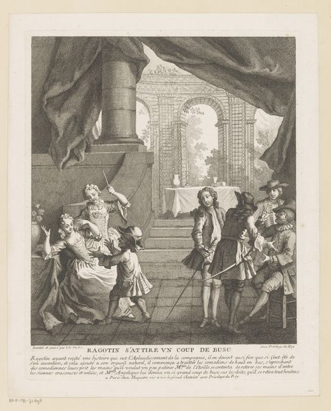 Louis Surugue made this print titled, "Departure of Sancho to the Island of Barataria," using etching. Made in the 18th century, this piece reflects the era's fascination with social hierarchy and power dynamics. We see the figure Sancho, from Cervantes’s famous novel *Don Quixote*, taking leave to govern his island. Look closely, and you will see that Surugue captures a poignant moment of farewell. Notice the kneeling figure expressing reverence, and the tearful goodbyes from the women to the left, which highlights the emotional complexity of Sancho's new role, while also reflecting how the artist and his contemporaries viewed power and governance through the lens of emotion and personal relationships. What does it mean to elevate a commoner to a position of authority? What impact would this elevation have on the community and the individual? This artwork is a reflection on the expectations and realities of leadership and social mobility during the Enlightenment.
