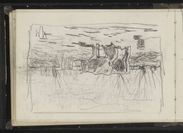 Curator: Welcome. Here we have "Trees and Bushes on Both Sides of a Canal," a pencil drawing by Anton Mauve, created sometime between 1848 and 1888. It's currently held in the collection of the Rijksmuseum. Editor: Immediately, I am struck by the artist’s hand. The lines have such an understated urgency; it conveys a melancholic beauty, wouldn't you agree? Curator: Indeed. The visible pencil strokes reveal the materiality of the piece, reminding us that this is an object composed of graphite and paper. Note how the horizontal hatching defines the volume of the foliage, playing with light and shadow to create form. The contrast suggests a specific, transient moment. Editor: For me, the trees framing the waterway feel almost like guardians. Trees and water often signify interconnectedness—the source of life, mirrored reflections—reminding us of our relationship with nature and the continuous cycle of change and continuity in nature. Curator: Quite. Moreover, the repetitive mark-making is integral. The diagonal, cross-hatching technique suggests depth, rendering this relatively flat, two-dimensional surface into a seemingly navigable landscape. It is both realistic and evocative. Editor: There’s also something archetypal about the image. The motif of mirroring is something universally appealing in different cultures. Water symbolizes the subconscious, a point of access for inner understanding. Mauve offers this gentle invitation to introspection. Curator: Undoubtedly, the artist has harnessed a remarkable understanding of structure, tone, and visual rhetoric. There's so much conveyed with so few apparent resources. It truly is masterful in its own unassuming manner. Editor: Absolutely. What seemed like a casual landscape sketch now speaks to the underlying rhythms of life and perception.