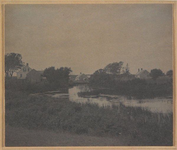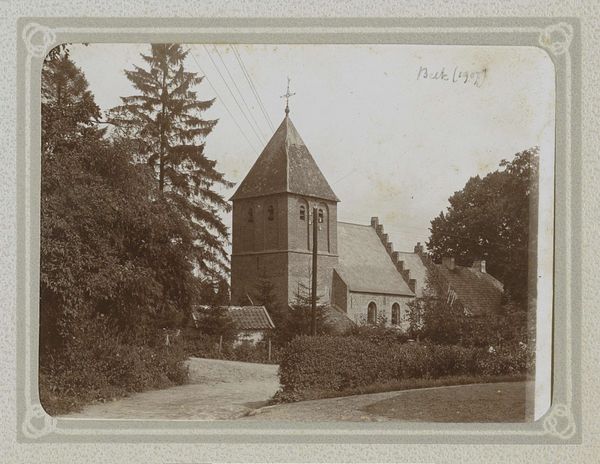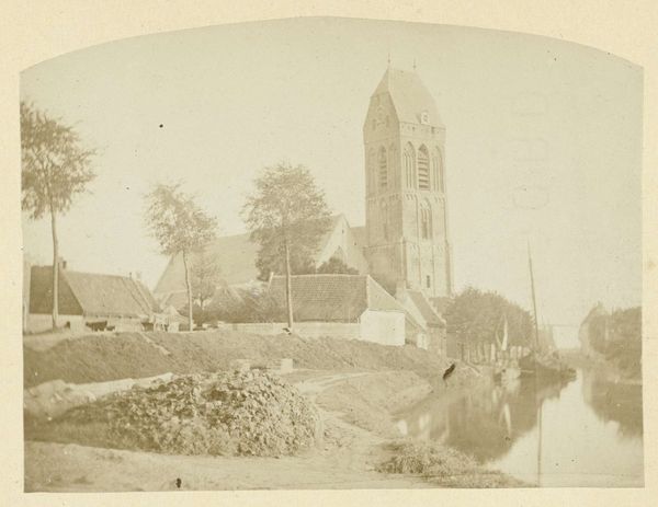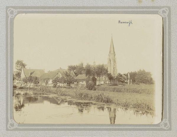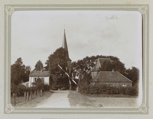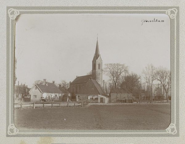 Curator: Welcome. Before us hangs Folkert Idzes de Jong’s photographic print, "Gezicht op huizen, de kerk en een brug over een sloot in Terzool," dating from around 1905 to 1907. It offers a view of houses, a church, and a bridge spanning a ditch in Terzool. Editor: Immediately, I’m struck by the stillness, a kind of hushed reverence in this seemingly simple landscape. It feels very Dutch, very…grounded. I can almost smell the damp earth. Curator: The realism here isn’t just about depicting a place, but also conveying a particular moment in time and societal development. Think about early 20th century Netherlands—industrialization was creeping in, and photographs like these arguably documented a way of life that was already changing. Editor: It’s melancholic, though, right? This village feels self-contained, a world unto itself. But the photographic process, it makes me wonder, did the artist see something we don’t, some omen of transformation? It reminds me of old family portraits. There is a gravity about the monochrome image. Curator: Absolutely. And consider the artistic choices, perhaps a nod to the aesthetic standards of his time. The composition adheres to landscape conventions, inviting the viewer to contemplate the relationship between community and land. The bridge, the church tower – each contributes to a silent, intersectional narrative about social identity, beliefs and progress. Editor: I fixate on the bridge. It's sturdy yet somehow delicate. Does it signify connection? Division? I'm probably over-romanticizing. Perhaps it just illustrates… practicality? A need to navigate. Also, there is no people. It is only architectural environment Curator: Perhaps. The absence of people itself speaks volumes about how rural society has been historically represented—often idealistically, stripped of the complexities of human interaction. Editor: I still see that little shimmer in the ditch and consider this photographic choice by the photographer to depict the simplicity, the common environment for what it really is. No enhancements, no people to make the moment dramatic. Just life! I'm sure this reflects the community of this town to this day. Curator: So, considering it through our contemporary lens, de Jong’s photograph challenges us to explore the intertwined historical contexts that continue to inform cultural identity. Editor: Precisely. I find a profound, almost spiritual element lurking in the simplicity of a ditch reflecting a church tower! Thanks for opening up the background context, its intersectional narrative truly enriched the whole work!