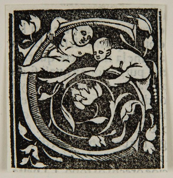 Curator: Here we have "Letter T", an intriguing piece from an anonymous artist, residing in the Harvard Art Museums. Editor: My first impression is whimsy meets archaic seriousness—the stark black and white, but then these little cherubs riding what look like... dolphins? Curator: Exactly! Notice the intricate details—the leaves sprouting from the 'T', the almost medieval quality to the figures. Editor: It's like a playful initial for some grand, forgotten manuscript, yet there is a rigidity in the composition—the stark contrast, the symmetrical cherubs. Curator: Perhaps suggesting that even in ornamentation, there is a structure, a hidden order. It is quite charming, don't you think? Editor: Indeed. It’s a fascinating glimpse into a past where even the alphabet held a touch of magic.