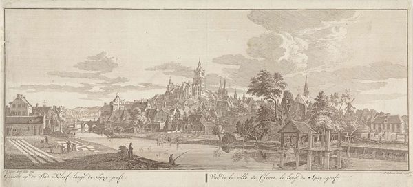 Editor: This print, titled "View of the Chateau de Madrid and the Pavillon de Bagatelle near Paris," was created by Elise Saugrain in 1783 using etching. The cityscape has such a peaceful, almost dreamlike quality to it. What strikes you when you look at this piece? Curator: It's fascinating how Saugrain depicts these landmarks. The Château de Madrid and the Pavillon de Bagatelle were both symbols of royal power and extravagance right before the French Revolution. Considering the looming societal upheaval, doesn't this image feel like a deliberate visual statement? A nostalgic, idealized version of the aristocracy, perhaps? Editor: That’s a good point. It almost feels like a stage setting. Do you think the way it's rendered as a print influences that feeling, rather than a painting? Curator: Absolutely. Prints in this era often served a propagandistic purpose. They disseminated imagery and reinforced certain narratives. Look at how detailed and precise the etching is; it's not just capturing a scene but constructing a very particular, controlled image of these locales. It makes me wonder about the intended audience. Who do you think was meant to consume this vision of royal grandeur? Editor: Possibly the wealthy merchant classes, to reassure them? Or maybe even as propaganda targeted outside of France, projecting an image of strength? Curator: Exactly! It's likely designed to reinforce an idealized perception of France, projecting an image of serene stability to both domestic and international audiences, just as things were starting to crumble. That makes this seemingly simple landscape a rather loaded political statement, doesn't it? Editor: It's amazing how much historical context changes how you read a seemingly simple picture. Curator: Indeed! By examining the social context surrounding a piece, we unlock so much meaning.