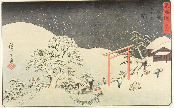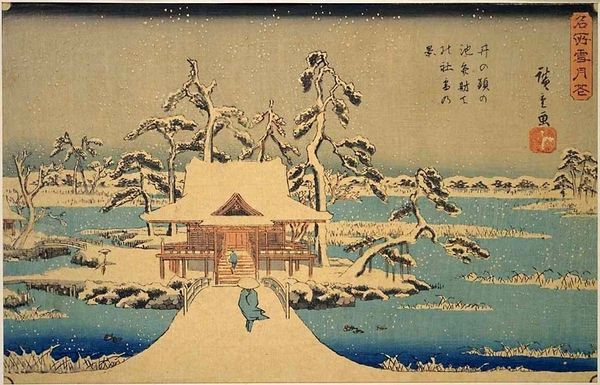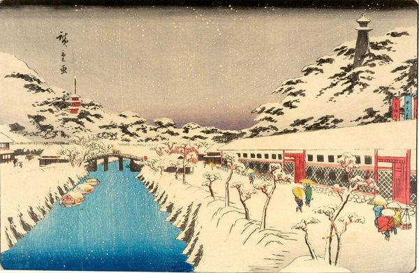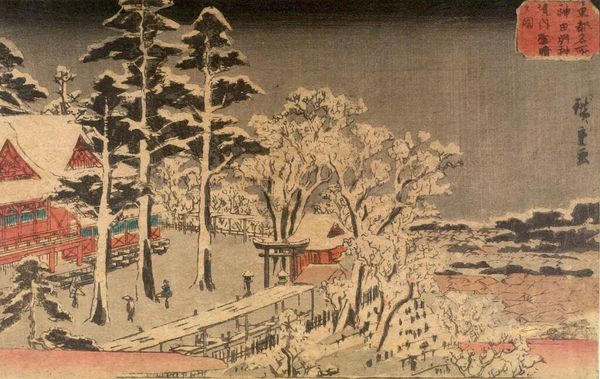 Editor: This is Utagawa Hiroshige's "TÅeizan Temple at Ueno," from his series "Famous Places in Edo." It’s so serene, almost dreamlike, with the snow blanketing everything. What's your take on the feeling it evokes? Curator: It’s a dance of contrasts, isn’t it? The stillness of the snow, yet the vibrant red of the temple hinting at warmth and life. I wonder, did Hiroshige choose that vermilion to pop against the wintry scene, or perhaps to suggest an eternal flame amidst the chill? Editor: That's a beautiful idea! It's like a pocket of warmth within the cold landscape. Curator: Exactly! And notice how the figures seem to almost melt into the scene, dwarfed by the temple. A gentle reminder of our place within something greater, perhaps? Editor: I never would have considered that. Thanks! Curator: My pleasure. Art's a conversation, after all, and your questions brought new light to it.