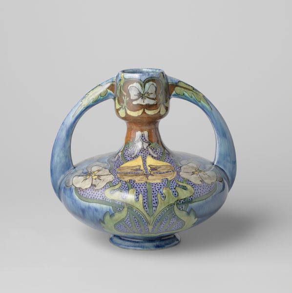 Curator: Here we have an intriguing piece from De Porceleijne Fles, a Dutch pottery manufactory, this is a vase crafted sometime between 1880 and 1920. Its earthenware body is adorned with a stylized flower and leaf pattern characteristic of the Art Nouveau movement. Editor: Oh, it's so whimsical! It gives me this fairy-tale vibe. It feels delicate, almost like it belongs in a forest, the home of elves, a Midsummer Night’s dream sort of energy... Curator: Yes, the shape itself is rather unique—that slender, geometric form topped with what look like stylized wings. And the repeated motifs of leaves and blossoms underscore the Art Nouveau’s celebration of natural forms, while demonstrating the commodification of nature by industrial manufacturing processes of the time. Editor: Right? The colors too, are restrained but cheerful, but there's a slight coldness in the geometry. A reminder maybe, of industry consuming that delicate floweriness that’s being celebrated in the ornamentation. It's pretty yet the artist perhaps wanted to acknowledge industrialization’s effects at the time? I feel the need to bring in flowers just to counterpoint it! Curator: Indeed, the interplay between decoration and industrial production raises interesting questions about art’s function within broader economic structures. Was this vase designed for everyday use, or was it meant as a purely decorative object catering to a specific consumer class? Who was buying it? And were those flower motifs more than just an aesthetic choice or perhaps they also served as silent statements about labor conditions, consumerism? Editor: Food for thought. Seeing it through your perspective sheds so much more light onto its significance. I'll look at any delicate ceramic piece I find with newfound questions to consider about material and method, after our little discussion. Curator: And perhaps now when looking at industrial design from this period we both will remember to find, or bring, our flowers, for some human-natural connection.