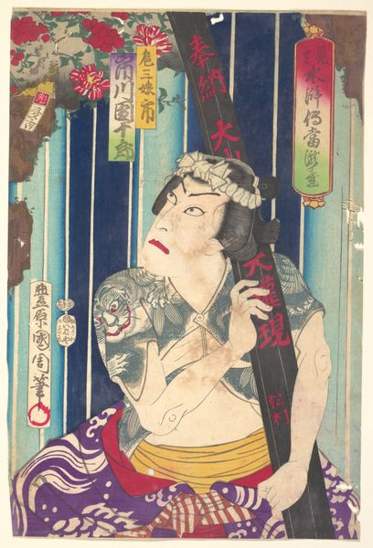 Editor: This is Toyohara Kunichika's "Imaginary Portrait, Shuihuzhuan of Stage: Tōryūdai (Mitate Suikoden Tōrōdai) - Actor Nakamura Shikan plays Suekichi" from 1875, a woodblock print. The theatrical figure and bold tattoo really stand out. What draws your attention most in this print? Curator: Immediately, it’s the visual language linking performance, identity, and folklore. Notice how the actor *becomes* Suekichi, signified not just by costume but also by that incredibly rendered tattoo – a *shishi*, or lion-dog. Editor: A lion-dog... how does that relate to the character? Curator: In Japanese iconography, the shishi is a guardian figure, often seen at entrances to sacred spaces. Here, the shishi isn’t merely *on* the actor; it seems to emanate *from* him, embodying the character’s protective, possibly even fierce, nature. Look at the piercing eyes. How does it strike you? Editor: It does have this protective energy; the way it's intertwined almost makes them a singular being. The figure's blank stare contrasts with the lion-dog’s intense gaze, which I find really intriguing. Curator: Exactly. This contrast highlights the performative aspect of identity. Suekichi isn't just a role, but a mantle adopted, a spirit embodied. Also consider the *ukiyo-e* tradition – these prints weren’t simply art objects; they were a form of publicity, solidifying the actor’s persona in the public imagination. Editor: So, the symbolism adds layers beyond just a portrait... Curator: Precisely. It's about constructing a narrative, embedding cultural meaning into a single image, turning actor, character, and folklore into a powerful, unified symbol. Editor: That's fascinating. I had considered the tattoo as a costume detail but now understand its cultural weight. Curator: Seeing how images embody shared beliefs gives a powerful connection between the artwork and our human experience.