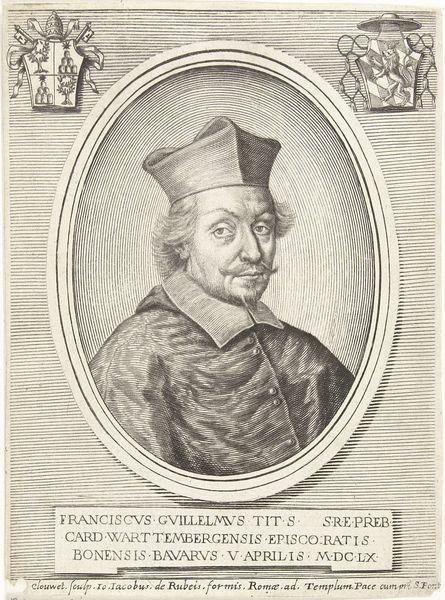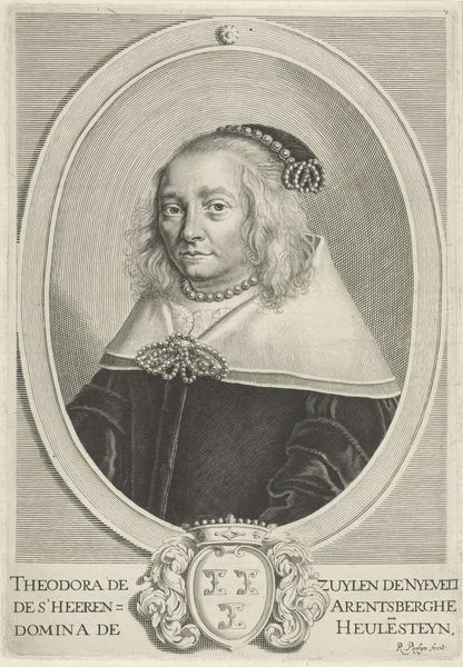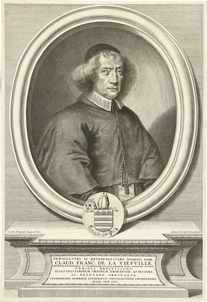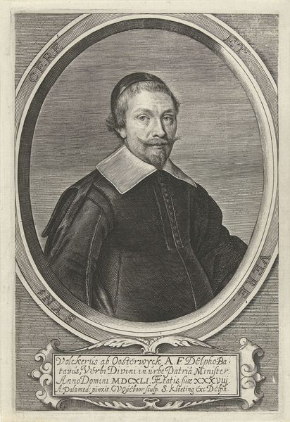 Editor: This is a print entitled *Portret van Joannes de Romiet* by Crispijn van de Passe II, dating back to 1633. It’s an engraving. I find it to be a rather formal portrait, capturing a distinguished gentleman, but what I’m wondering is, what do you see in this piece? Curator: It’s more than just a formal portrait. Consider the power dynamics at play in 17th-century Dutch society. Portraits like these were carefully constructed to project authority and status. De Romiet was a member of the elite class in the city, but what social message is it that the artist is communicating? What about the presence of Latin text surrounding the frame? Editor: The text suggests virtue and resilience, "virtus perseverantia"... so does that mean he wanted to project an image of not just power but also moral strength? Curator: Precisely. These portraits reinforced a narrative of social order, often overlooking the realities of inequality and exploitation within Dutch society at the time. Think about who was being excluded from these portrayals. Editor: So, by focusing only on the elite, these images perpetuated the existing power structures and essentially erased the stories and struggles of the majority. The composition subtly but actively bolstered the status quo. I never considered how something like this could function politically. Curator: Exactly. Art is never created in a vacuum. Consider also how gender, race, class and political beliefs influence the very definition of "virtue" portrayed here. And how does that compare to the current intersectional understanding? Editor: This has really made me think differently about the role of portraiture in shaping historical narratives and consider how this particular piece serves a powerful social and political purpose beyond just representation. Thank you. Curator: And hopefully consider its implications to our present and future society. Thanks for the enriching discussion.