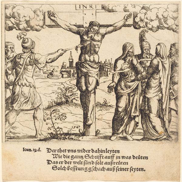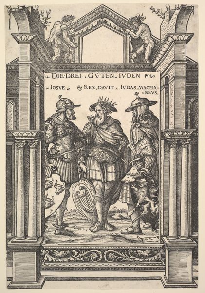 Curator: Let’s turn our attention to this engraving serving as an allegorical title page, dating from 1617. It precedes Pieter Christiaansz Bor's "Den oorspronck, begin ende aenvanck der Nederlandtscher oorlogen," or "The origin, beginning, and progression of the Dutch wars." Editor: It has a disquieting energy, doesn't it? The density of figures pressed together creates a sense of unease, despite the classical allegorical trappings. Curator: Absolutely. Notice how the composition divides roughly into two halves. On the left, we see figures representing, I believe, new bishops—their robes are rendered with fine, almost scratchy lines. On the right stands a figure in armor, holding a branch. Central to it all is the figure representing Belgica. Editor: That central figure, Belgica, really dominates the visual field. The starburst design on her chest, coupled with her raised hand, gives her a defiant stance. "Rijkdom" and "Weelde," or wealth and prosperity, flank her. But, it feels as if they are caged by "Nieu Bisschoppen." They want what they have! Curator: Precisely. The iconographic program speaks volumes. The bishops encroaching on Belgica symbolize the suppression of the Dutch provinces, whereas the armored figure possibly represents the forces pushing back against those repressions. Note how that branch that he carries is emerging from oak tree! Editor: I hadn't focused on that particular oak tree, or, rather, a branch from an oak. Is the suggestion that true liberty stems from these local "natural" roots rather than some centralized ecclesiastical structure? Curator: It could certainly suggest that. There is, moreover, a cartouche laying beneath the feet of Belgica, in which we can recognize the words "Privilege". Editor: Right! So it speaks of fundamental freedoms as well. All held in precarious balance here... it’s like witnessing the calm before the storm— the print has an impending sense of violence or enforced control, perhaps. Curator: Agreed. The visual tensions and symbolic density combine to form a potent statement, very much emblematic of its historical moment. Editor: Indeed, and the formal rigidity amplifies the dramatic allegory unfolding. An impressive convergence of design and historical messaging!