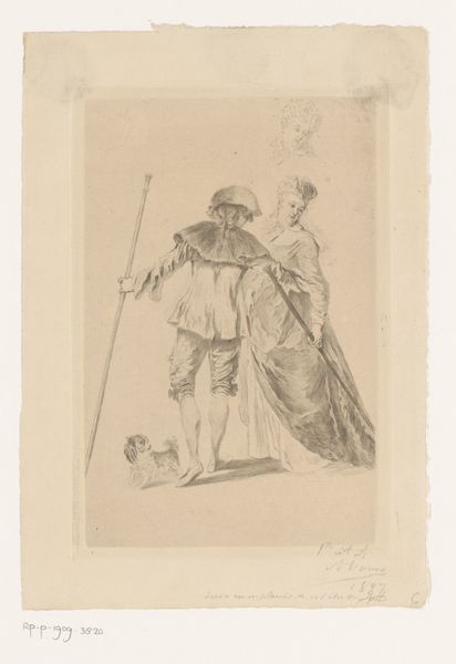 Editor: This is "Standing King with Incense Burner," an etching and engraving made around 1828, now held at the Rijksmuseum. The artist is William Young Ottley. It’s a bit mysterious, isn't it? Almost dreamlike with that sketchy style. What do you make of it? Curator: Dreamlike, yes! It’s got that feel of something remembered, or perhaps imagined, rather than observed. I love how the artist uses line – so spare in places, almost frantic in others. What strikes you about the figure himself? Is he proud? Defeated? Editor: Hmm, I’m not sure… He’s holding that incense burner, but he's got this downtrodden look about him. Like maybe the weight of royalty isn't all it's cracked up to be. Curator: Exactly! Notice how Ottley renders the king’s posture. Slightly stooped, perhaps burdened by his crown and ermine. He’s "standing," but barely. And the setting! It’s more suggested than defined, a backdrop to his inner turmoil. Do you think this is a literal portrait, or something more symbolic? Editor: Good point! Maybe he represents something larger than just one king. Maybe a commentary on power itself? Curator: Precisely! The fleeting quality of the etching medium complements this feeling of ephemerality. Kings rise and fall, empires crumble, and all we are left with is a smoky trace... perhaps captured perfectly here. Editor: It’s fascinating how much is communicated with so few lines. It makes you think. Curator: It does, doesn’t it? It reminds us that art isn't just about what you see, but what you *feel*. Thanks for pointing that out.