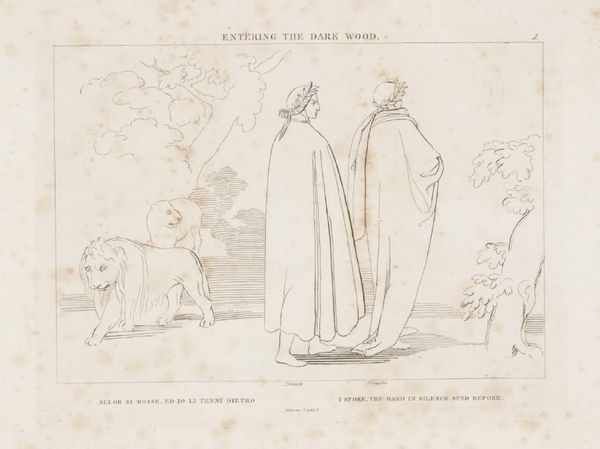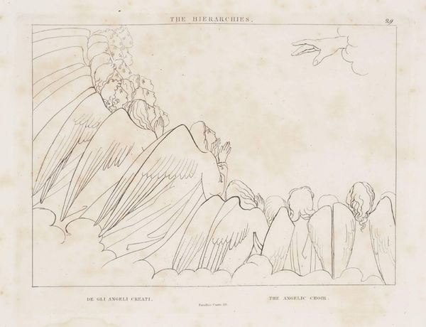 Curator: John Flaxman's pen and ink drawing, "Order of the Patriarchs," presents a vision of ascending figures. Editor: It feels serene, almost ethereal. The simple lines create a sense of lightness, as if these figures are indeed floating upwards. Curator: Flaxman, who lived from 1755 to 1826, often explored themes of moral virtue and spiritual elevation, drawing inspiration from classical and biblical stories. Notice how the patriarchs, depicted in flowing robes, gesture towards the heavenly figures above. Editor: The composition divides the scene into earthly and celestial realms, doesn't it? The delicate rendering of the clouds enhances this separation, creating distinct visual planes. Curator: Precisely. The linear style, reminiscent of classical friezes, reinforces the timeless quality of the scene, suggesting a continuity of faith and tradition. It speaks to enduring symbols of wisdom and guidance. Editor: Yes, I see that now. It's a quiet contemplation on faith and its visual representation through simple, elegant form.