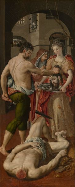 Curator: Domenico Tintoretto painted "Christ Crowned with Thorns," sometime in the late 16th or early 17th century. Editor: The immediate impact is one of stark vulnerability, heightened by the dramatic chiaroscuro. Curator: Absolutely. The composition focuses on Christ's suffering, but what is important is considering the social function of this type of imagery. It reinforced religious doctrine and legitimized power structures. Editor: I see the formal aspects serving this function. The artist uses color sparingly; the red cloth acts as a formal device that binds the composition together. What narrative sequence is implied by the figure's contorted pose? Curator: It's a representation of power, certainly, but the depiction also elicits pity and identification with Christ, a very calculated and self-serving move on the part of the Church. Editor: Still, the humanity is undeniable. And it’s compelling to see how line, light, and shadow work together to evoke such raw emotion, regardless of historical intent. Curator: A powerful intersection of art and propaganda, wouldn't you agree? Editor: Indeed, and a somber reminder of art's multifaceted nature.
