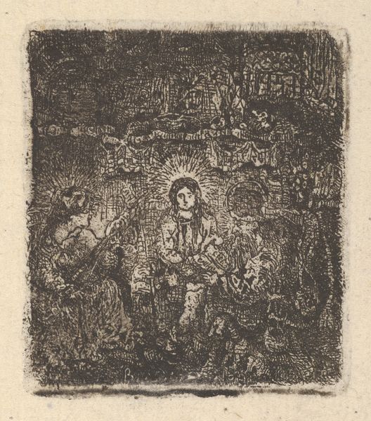 Editor: Here we have Paul Gauguin’s “Te Atua (The Gods) Small Plate [verso],” likely made sometime after 1895. It's a woodcut print, and right away, I’m struck by its almost dreamlike quality, the rough texture creating this feeling of looking into another world. What's your take when you see this work? Curator: Oh, that rough texture *is* the point, isn't it? Gauguin, bless his rebellious heart, wasn’t trying to make something conventionally beautiful. For him, it was about capturing a raw, almost primal energy. You see him grappling with the exoticism of the South Pacific, filtered through his own very Western lens, of course. I see shadows dancing, stories whispered across the ocean… Do you get that sense of searching, of a kind of beautiful, maybe flawed, appropriation? Editor: Absolutely. The figures seem to be emerging from, or perhaps sinking into, the background. Is he trying to depict the gods themselves or rather his own interpretation of them? Curator: Precisely! He's not documenting Polynesian deities, he’s *conjuring* them. And isn’t that more interesting? The heavy lines, that near-brutal carving… it’s as if he’s trying to unearth something deeply felt within himself, projecting his own romantic notions onto this "other" culture. Do you think it romanticizes a culture Gauguin never entirely grasped? Editor: I do, actually. There's a tension here, admiration mixed with a sort of colonial gaze. The contrast of darkness against a bit of light also creates mystery! Curator: That darkness is where the magic happens, I think. And that inherent tension, the space between reverence and appropriation – that’s where the real dialogue begins, doesn't it? I think looking into the dark shadows also speaks volumes of what’s already gone in culture, but still visible. I learned so much speaking about what appears romantic! Editor: This really sheds light on viewing art within its context and that, art will not be perfect!