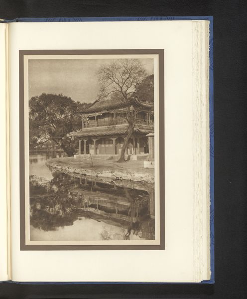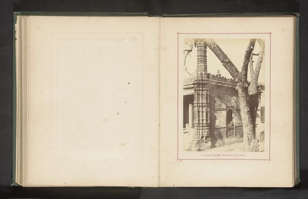 Curator: Before us is a photographic print by Thomas Biggs, entitled "Gezicht op de Hutheesingtempel in Ahmedabad," dating to before 1866. It's an albumen print, a very common photographic process at the time. Editor: There’s a distinct mood here – a stillness and sense of monumentality. The light, as captured in this albumen print, emphasizes the texture and patterns of the architecture itself. A tight framing draws us right in. Curator: The Hutheesing Temple is a Jain temple. The temple as a symbol in art often signifies a threshold—a liminal space between the earthly and the divine. Biggs captured a place imbued with profound spiritual meaning. Consider that during the early days of photography, simply capturing these spaces would influence their ongoing place in our cultural memory. Editor: Notice how Biggs has structured the composition, aligning the architectural planes, using shadow, creating a rhythm and depth, particularly in those arched portals and balcony spaces. We get an almost mathematical order here; however, this is somewhat disrupted by the organic lines and growth of the single, small, mature tree near the entrance. It stands in visual balance. Curator: Right, the tree acts as an intriguing contrast. In Indian art, trees are frequently symbols of life and renewal, representing cycles of rebirth and connection to nature. Perhaps Biggs subtly wanted to incorporate it to comment on the cyclical nature of time and the enduring relevance of spiritual spaces amidst changing societal landscapes. Editor: I appreciate the interplay of natural and geometric forms, the way Biggs allows those elements to communicate. But I find myself wishing he had pulled back some distance to allow more light and detail to reflect off and within the planes of the temple structure. Curator: What Thomas Biggs has provided here, through the photographic medium, allows us an invaluable perspective on an important religious and cultural landmark. His work serves as a vital historical document and continues to inspire dialogue. Editor: Ultimately, Biggs provides a structured and serene perspective, prompting deeper contemplation of geometric architecture within natural surroundings, a frozen point in a historical narrative.