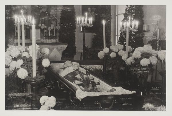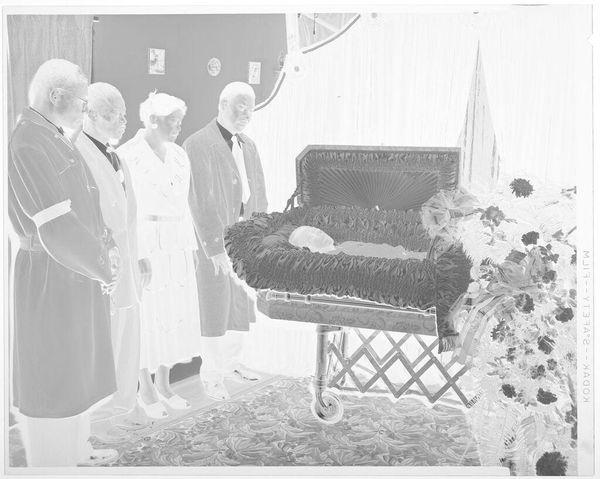 James Van Der Zee’s photograph, *Child's Funeral*, captures a staged scene with an open casket surrounded by flowers. The grayscale image, with its dark shadows and soft focus, feels heavy, a testament to the somber subject matter. But there’s a striking juxtaposition at play. The image has a surreal quality, with its montage of the funeral scene and an image of Jesus surrounded by children. I wonder what led him to combine them, as it softens the blow of death with a promise of eternal life and perhaps reveals something about the artist’s hopes and beliefs. Van Der Zee was known for his studio portraits documenting the lives of Black New Yorkers during the Harlem Renaissance. He was a kind of visual storyteller. Thinking about his broader work, I'm reminded of artists like Lorna Simpson, who use photography to explore issues of identity and representation, and how an image can carry multiple meanings. This piece embraces both sorrow and hope. It’s not just a picture; it's a whole conversation.