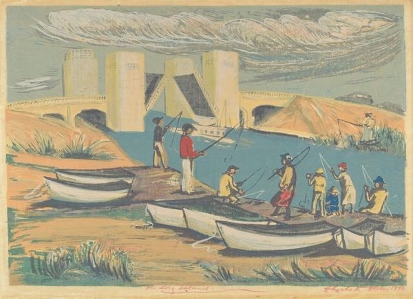 Editor: We’re looking at Cyprián Majerník’s "Povodeň," or "The Flood," painted between 1939 and 1940, created using oil paint. The figures in the boat look sombre, almost resigned. What do you see in this piece? Curator: It is precisely the use of oil paint that offers a way into understanding this work. Look at the application - thick, almost muddy, particularly in the rendering of the water and figures. This speaks to the scarcity of materials, doesn't it? Consider also the clothing; simply rendered, almost uniform. These weren't individuals presented as specific figures but instead represented a particular strata of society working within specific labour relations. Editor: So, you’re suggesting the materiality and methods speak directly to social and economic conditions? The simple representation of figures feels like it underscores their role as labourers, rather than individuals? Curator: Precisely. The “flood” isn’t just a natural event, but perhaps a representation of societal upheaval, reflected directly in the rudimentary techniques and inexpensive, readily-available oil paints utilized. The boats, how would you view these through a material lens? Editor: As tools of labor. Given that context, the image reads less like a dramatic flood scene and more like a commentary on labor during a crisis and what’s immediately at hand as recourse to survival. Curator: Indeed! This piece exemplifies how art can provide a window into understanding the relationship between artistic labor, materiality, and social context. We start questioning the narrative: who produces art, with what materials, and what that reveals about the society that shaped the work. Editor: It gives new meaning to 'making do'! It makes you realize that even limited materials tell a powerful story about labor. Thanks for sharing your insights.