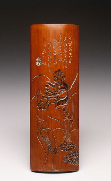 Editor: So this is the "Ink Tablet," dating from between 1871 and 1933, by Xiu Fangzhai. It's located here at the Met. The carved landscape really draws me in – it’s so detailed but also feels like it fades into the dark background. What's your take on the imagery here? Curator: The enduring power of the "Ink Tablet" resides in its symbolic vocabulary. Notice the landscape—mountains were revered as sacred places, abodes of immortals and symbols of stability, embodying the concept of permanence within a changing world. Editor: I see how the mountains have a deeper connection to stability. Does that apply to the water imagery as well? Curator: Absolutely. The water, often depicted as mist or flowing rivers, signifies adaptability, change, and the cyclical nature of life. This opposition, stability and change, is essential to understanding its message. Also, what do you make of the inscription, and where it's placed in relationship to the other elements of the tablet? Editor: It seems separate somehow... the eye is drawn into the landscape carving before the calligraphy on the side. Curator: Indeed. Consider the visual weight it holds versus the landscape—it denotes authorial presence and lends legitimacy. Inkstones like these were not mere tools but objects of contemplation, miniature worlds reflecting profound philosophical ideas. It encouraged the user to consider balance, harmony and their relationship with the natural world. Editor: That’s fascinating. It completely changes how I see it, not just a functional item but as something rich with meaning. Thanks! Curator: It reminds us how everyday objects can be powerful carriers of culture and history. It’s been my pleasure.